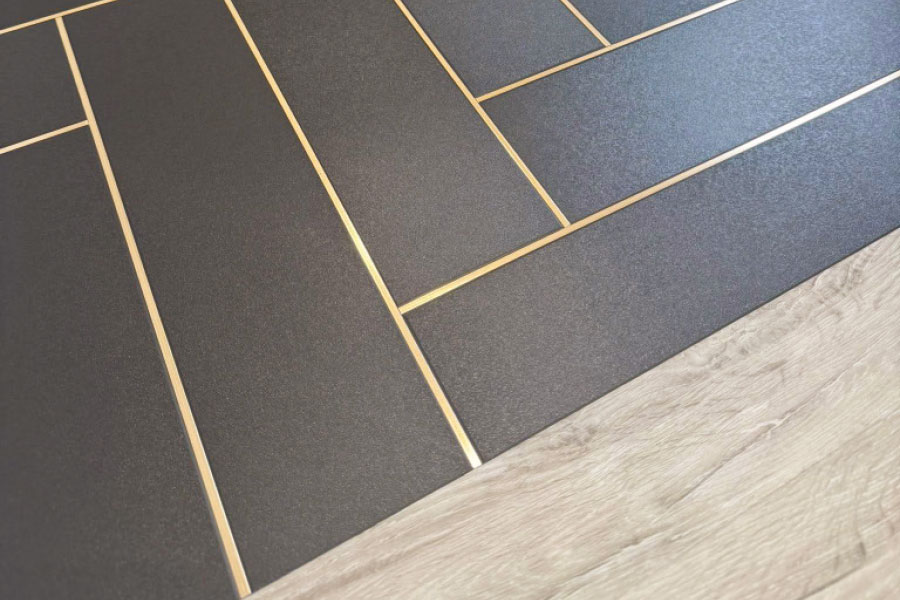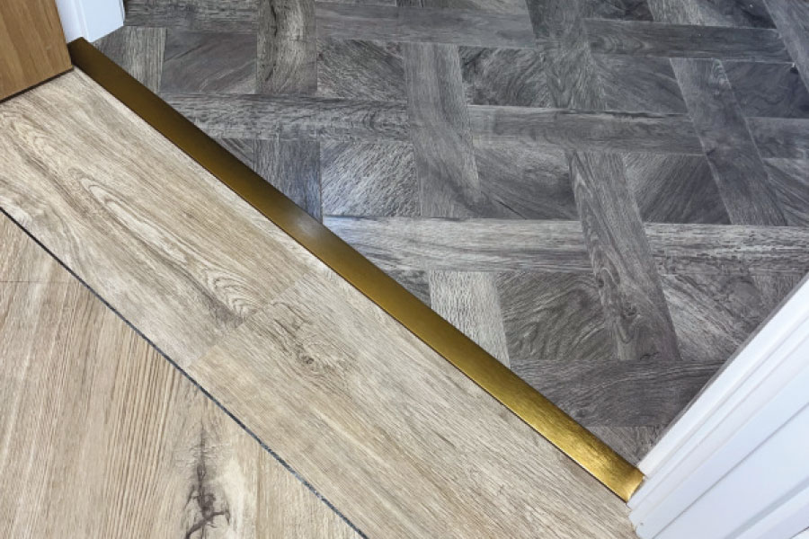 Ali Trims work seamlessly with Stairrods’ Ali Inlay metal design strips, developed specifically for use with 2.5mm and 3mm gluedown LVT flooring.