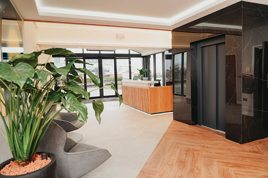 Concurrently, the team installed 6mm ply for kitchenettes, adhering it to raised access flooring for subsequent IVC LVT installation. Later stages addressed challenging areas, including a corridor transitioning into the reception. Here, the team applied 6mm ply to raised access areas, followed by F Ball 1200 latex screed, and installed IVC LVT herringbone and tile. Work extended to a high-end café with raised access floors, incorporating IVC Sabbia sheet vinyl, Amtico’s Designers Choice, and IVC herringbone.