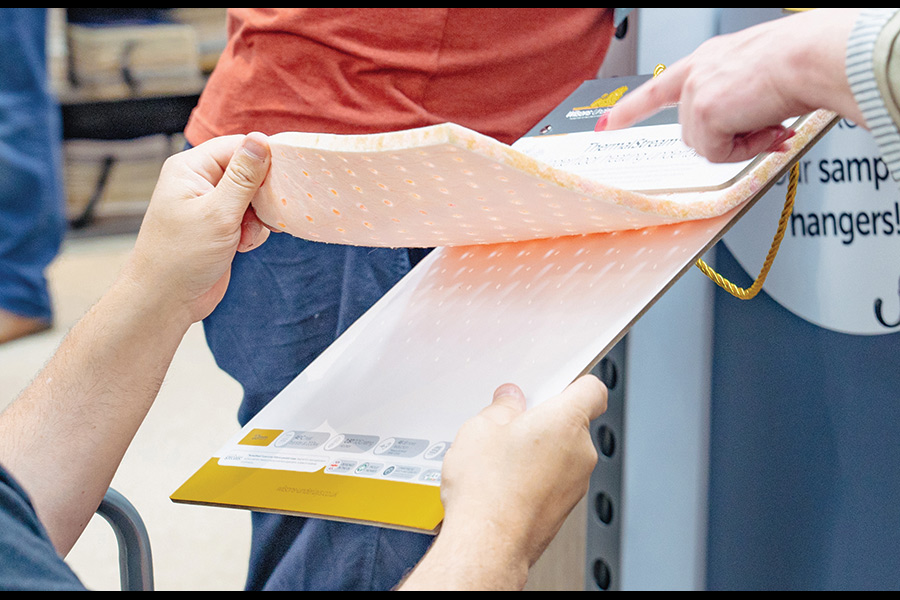 Another newcomer to our showcase this year was our ToughStep display, showing visitors how ToughStep has been specifically engineered as a double-stick underlay for commercial applications, or for natural floor coverings such as sisal, where a firmer underlay is essential. Its structure is stronger and denser than standard foam underlays, providing greater stability and resilience for these types of applications. This delivers superior performance for natural carpets like sisal, which are rigid and have almost no elasticity compared to wool or synthetic carpets. A firmer underlay helps keep these floorcoverings stable and prevents rippling or distortion. In addition, ToughStep’s firmness allows office chairs, wheeled furniture, and wheelchairs to move with less resistance when installed using a double-stick method.